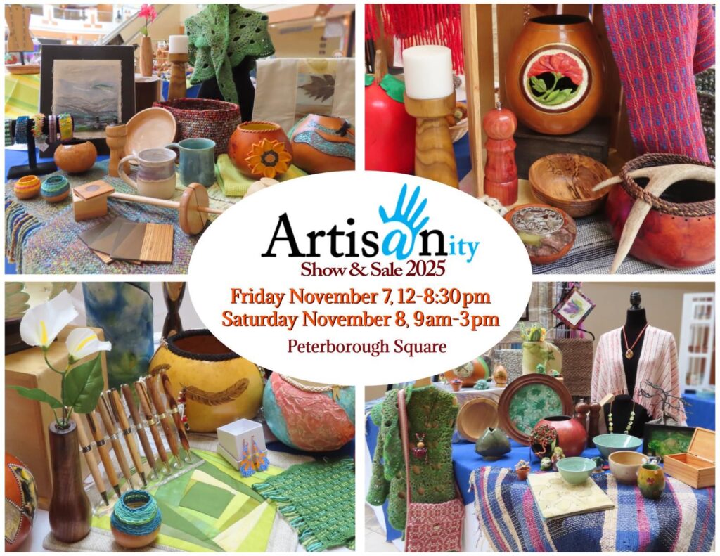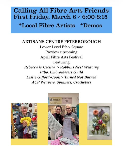 Visit the Artisans Centre in Peterborough Square this First Friday Ptbo! Get a early sneak peek of featured fibre artists and vendors who will be in the upcoming Ptbo Weavers and Spinners Guild’s Fibre Arts Festival & Sale this April!