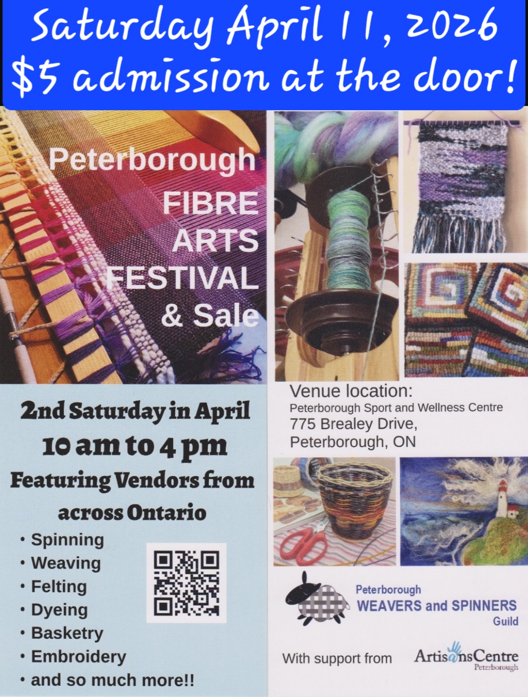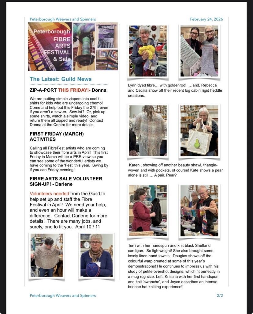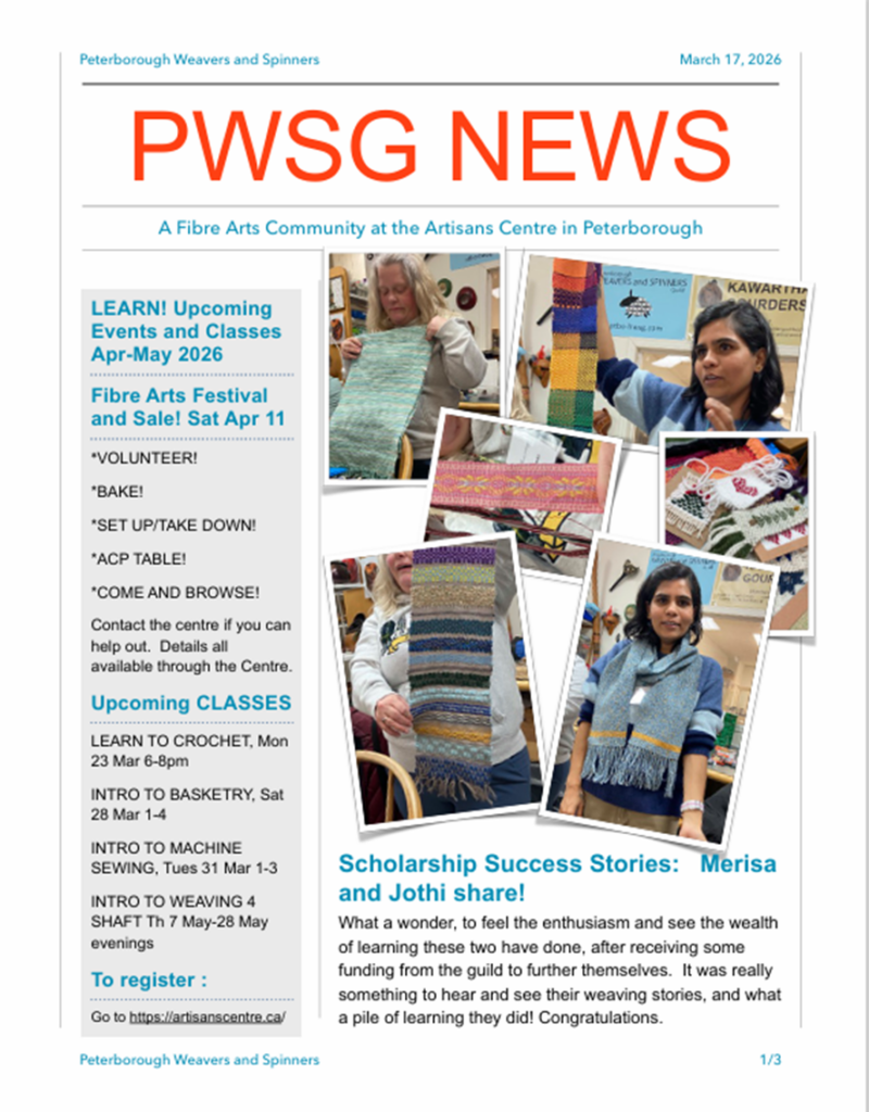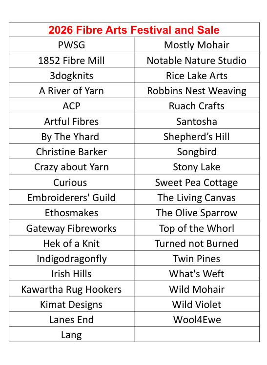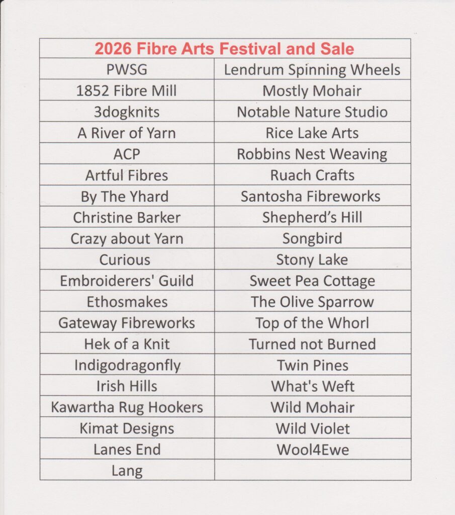 The 2026 Peterborough Fibre Arts Festival & Sale will be held Saturday, April 11, at the Peterborough Sport and Wellness Centre, 775 Brealey Drive, Peterborough, Ontario, 10am-4pm. There will be Free Draws of items from the vendors. The draws will take place every hour during the festival (11:00, 12:00. 1:00, 2:00 and 3:00). Admission is $5.00, children 12 and under free when accompanied by an adult.